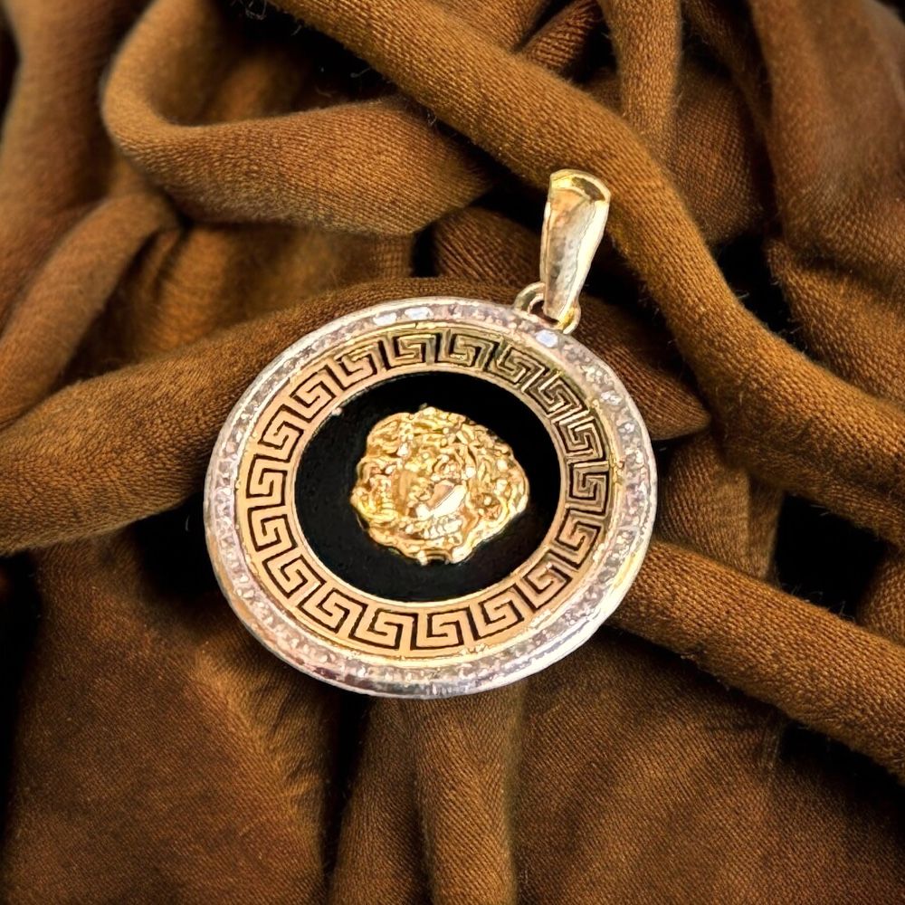 COLGANTE MEDUSA ÓNIX624,96 €Colgante Redondo Medusa con Ónix, Greca y Orla de Circonitas 20.00 mm Oro 18 Kilates.