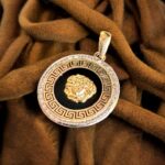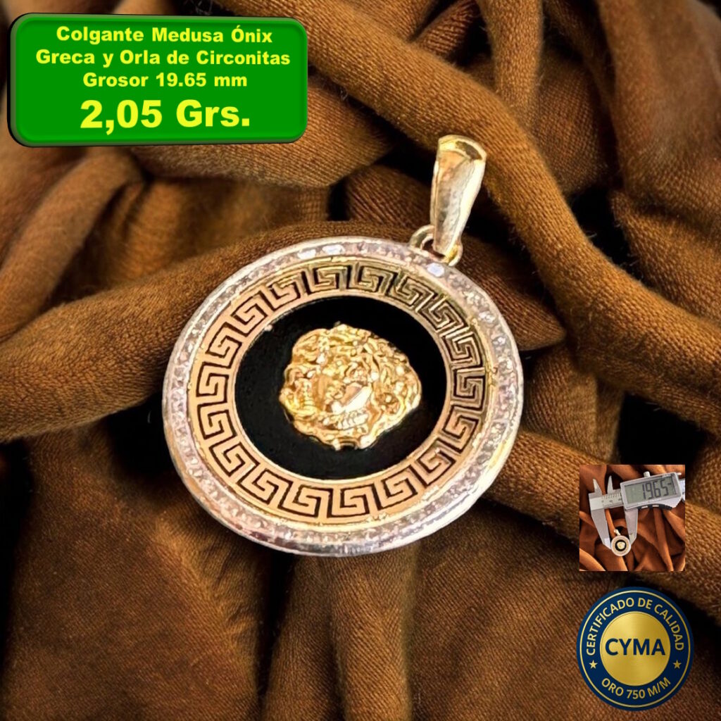 Colgante Redondo Medusa con Ónix, Greca y Orla de Circonitas 20.00 mm Oro 18 Kilates.