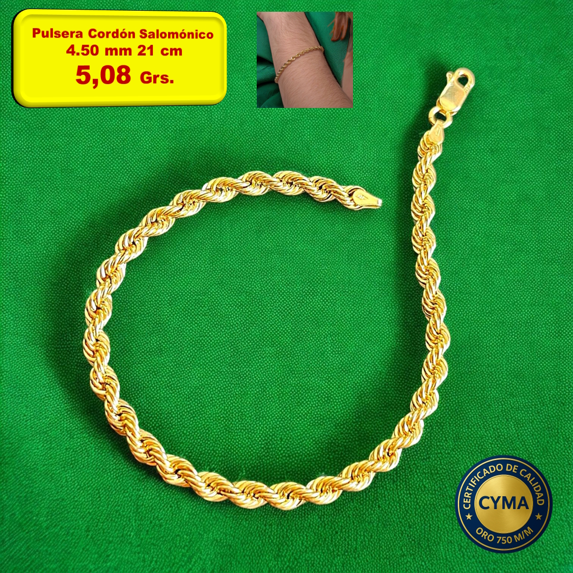 PULSERA CORDÓN SALOMÓNICODesde 677,28 € hasta 738,33 €Pulsera Cordón Salomónico Grosor : 4.50 mm Oro 18 Kilates con Cierre de Mosquetón