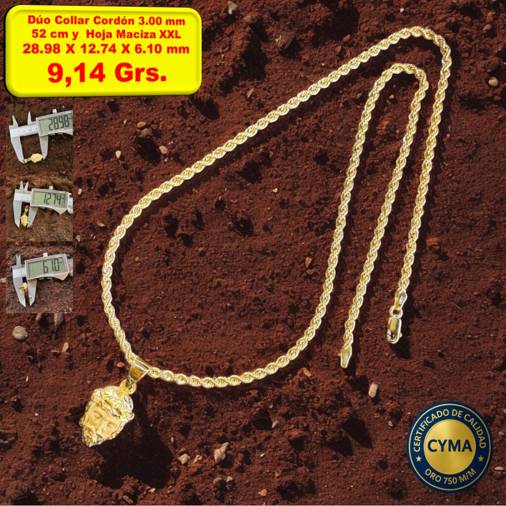Dúo / Conjunto Collar Cordón Salomónico 3.00 mm y Colgante Cara de Cristo Fuerte S Relieve Oro 18 Kilates.