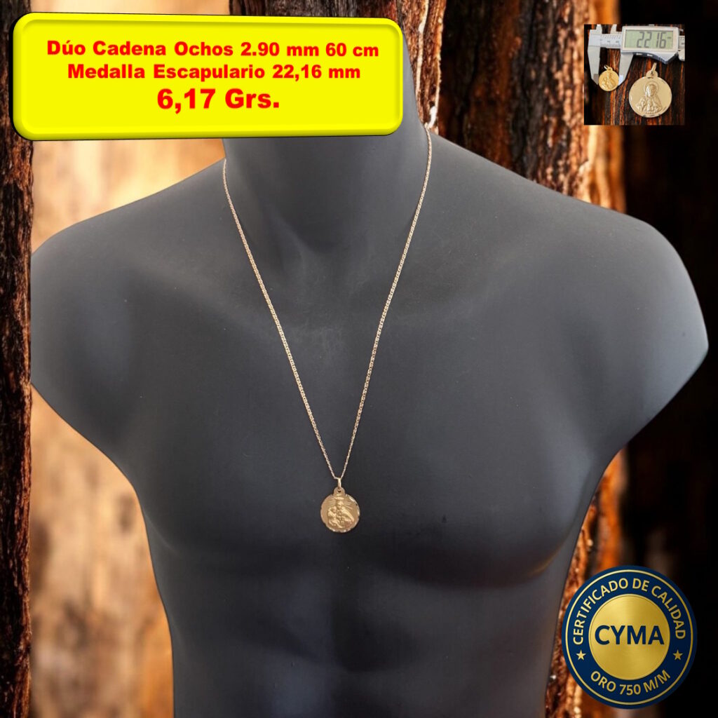 Dúo / Conjunto Cadena Ochos Italiana 2.90 mm y Medalla Escapulario Oro 18 Kilates, Se fabrica en distintos largos.